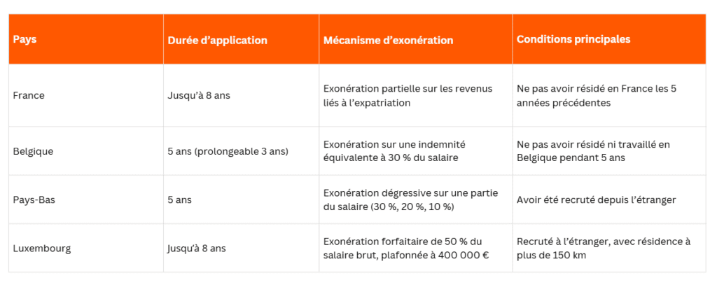 Dans un environnement européen compétitif, plusieurs pays ont mis en place des régimes fiscaux visant à attirer les travailleurs hautement qualifiés. Voici un aperçu comparatif des principaux dispositifs.